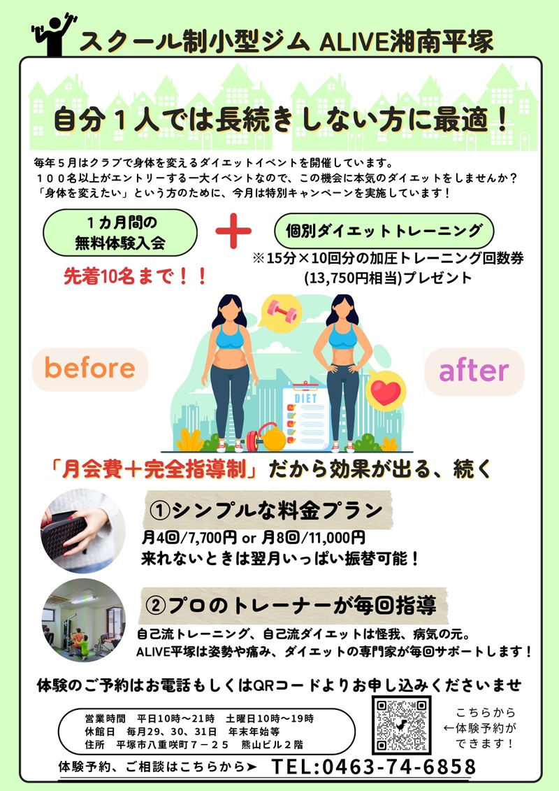 「健康・痛み改善・ダイエット」に関するお得情報はこちら ↓ALIVE平塚LINE公式アカウント↓