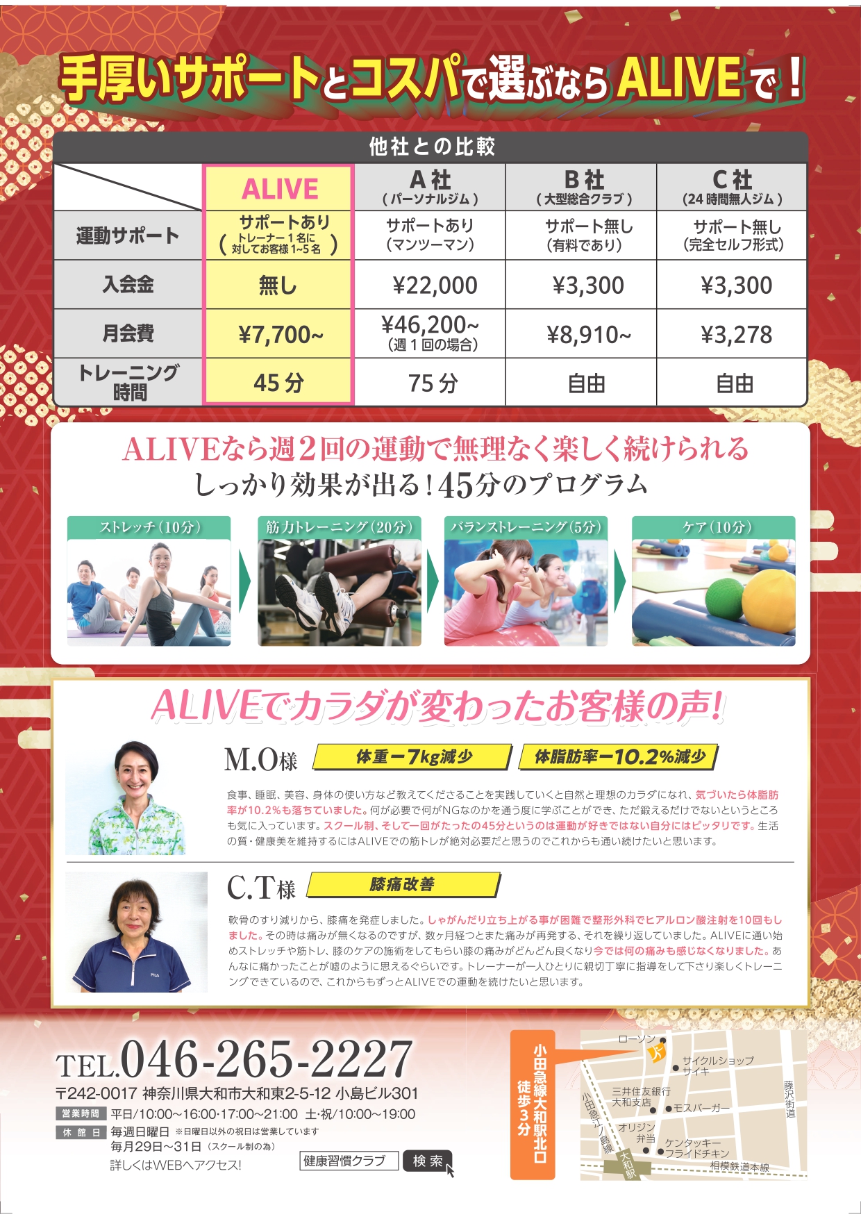 「健康・痛み改善・ダイエット」に関するお得情報はこちら ↓ALIVE大和LINE公式アカウント↓